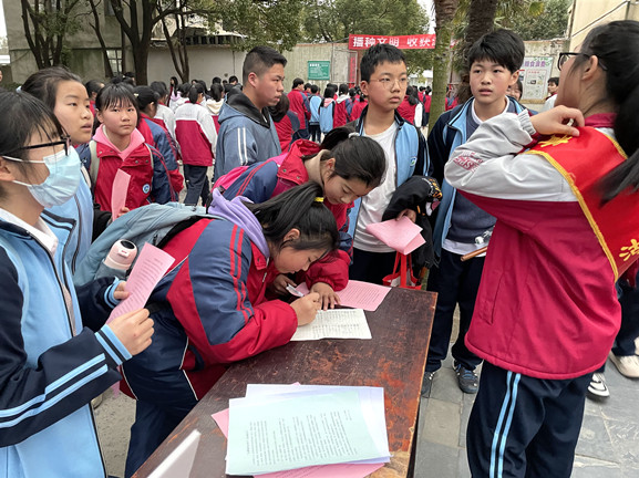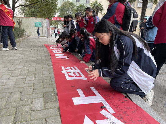 3月3日的湖口二中校园异常热闹。在学校中心花坛世纪之星雕塑的一边,青年志愿者向师生发放倡议书,一年一度的志愿者招募行动正在如火如荼开展;另一边,师生们纷纷在横幅上认真签上自己的姓名,“让座,从我做起”活动签字仪式劲爆登场。