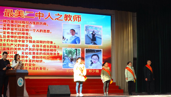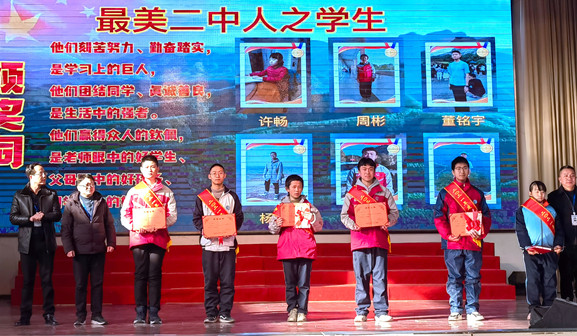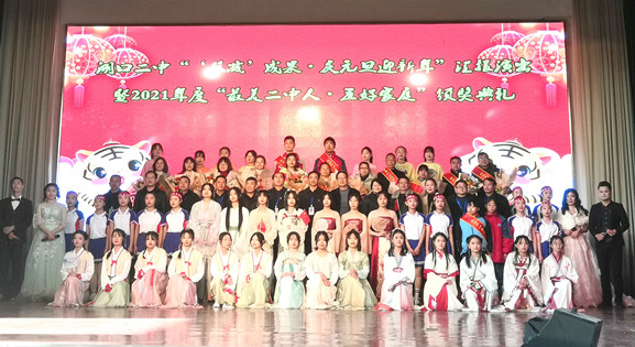 演出过程中,对2021年涌现出的“最美二中人”以及“五好家庭”进行了表彰。各位来宾与学校领导登台为其颁奖。他们之中,有披星戴月、孜孜不倦的一线教师,也有刻苦努力、勤勉自强的莘莘学子,还有辛勤付出、默默奉献的学生家长。他们的感人事迹深深打动了在场观众,赢得喝彩连连。