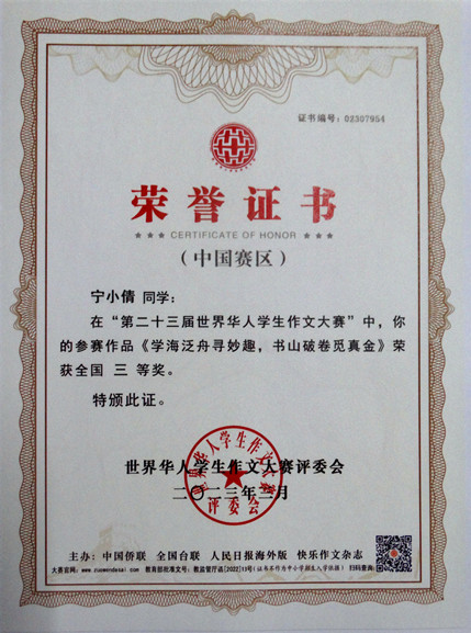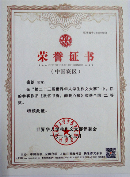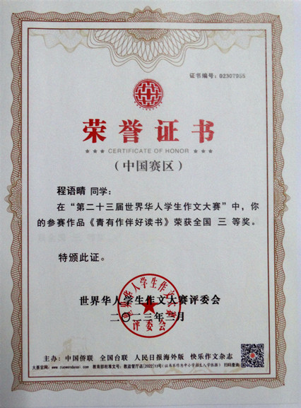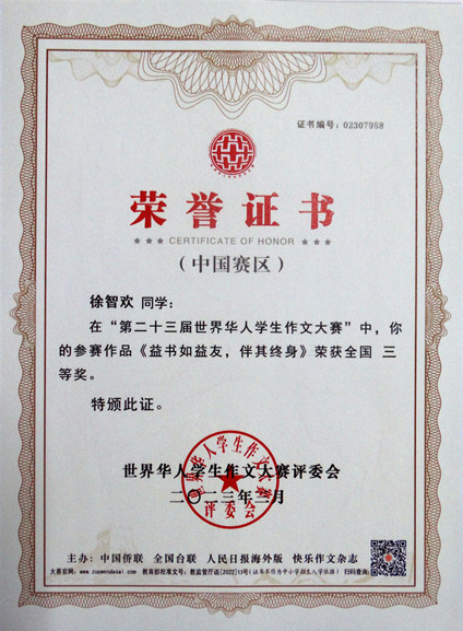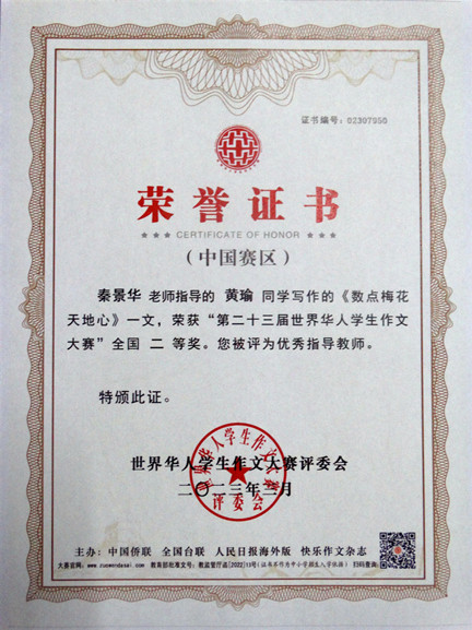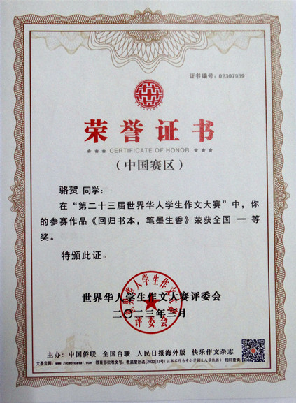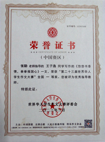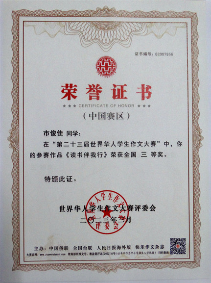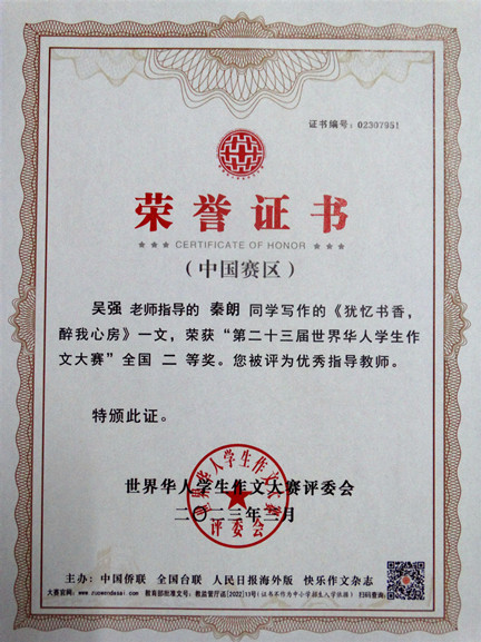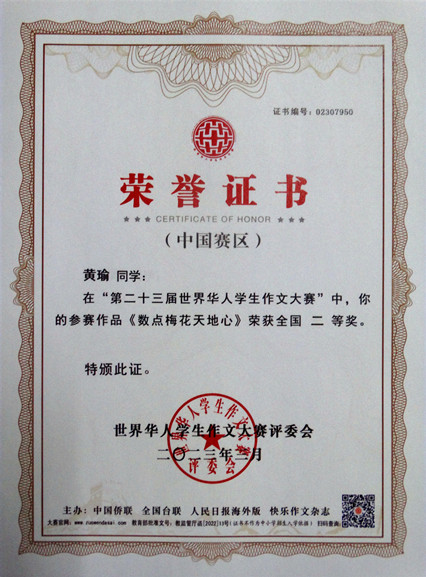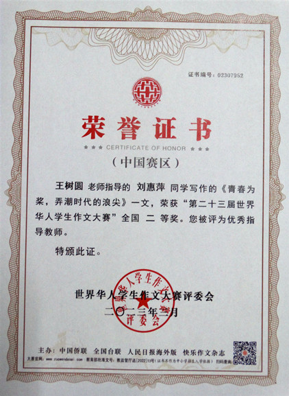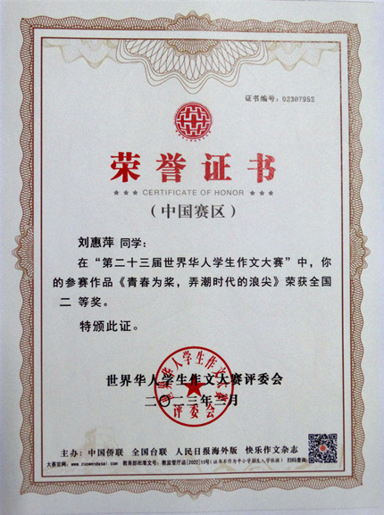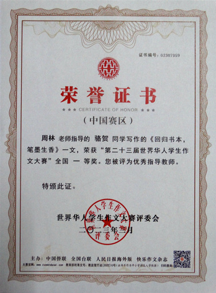 近日,从第23届世界华人学生作文大赛中传来捷报,湖口二中王子逸、骆贺获全国一等奖,刘惠萍、秦朗、黄瑜获全国二等奖,程语晴、宁小倩、徐智欢、市俊佳、沈春天、余开心等6人获全国三等奖。张勖、周林等10名教师获得指导奖。