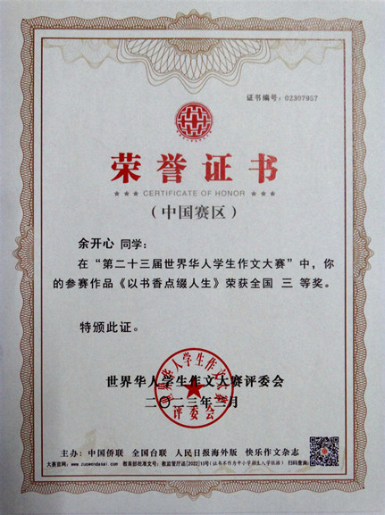11 | 全国三等奖 | 余开心 | 《以书香点缀人生》 | 王树圆 |