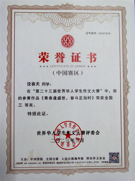 世界华人学生作文大赛由中国侨联、全国台联、人民日报海外版、快乐作文杂志联合主办,被列入教育部2022-2025学年面向中小学生的全国性竞赛活动名单。本届大赛共吸引了来自46个国家和地区的280多万华人华侨学生参赛,评委会共收到复审稿件32万7千多份。大赛评委会专家评审团本着公开、公平、公正的原则,严格执行初审、复审、终审+复核的稿件评审制度,一等奖稿件采用各省专家评委交叉阅卷+评委会统一复核的评审流程,并严格过滤抄袭、拼凑稿件。