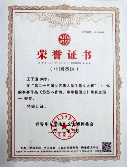 1 | 全国一等奖 | 王子逸 | 《悠悠书香情,拳拳报国心》 | 张勖 |