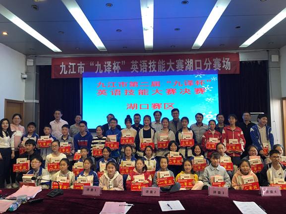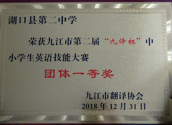 5月上旬,九江市第二届“九译杯”中小学生英语技能大赛总决赛举行。湖口二中获得该项比赛全市最高荣誉,并且是全县唯一一块奖牌——团体一等奖。同时,我校沈梦丽、刘涵文同学获得个人一等奖,王家格、李仁逸、王悦等7名同学分获二、三等奖。