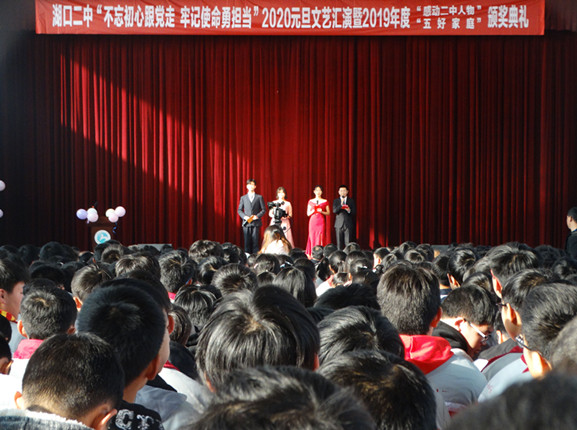 “天地风霜尽,乾坤气象和;历添新岁月,春满旧山河。”缤纷绚烂的2019在收获中渐渐远去,充满希望的2020正满怀激情地向我们走来。12月31日上午,湖口二中“不忘初心跟党走 牢记使命勇担当”2020元旦文艺汇演暨2019年度“感动二中人物•五好家庭”颁奖典礼在青少年体育俱乐部隆重举行。县教体局党委书记、局长许剑松,县总工会常务副主席余锦霞,团县委书记蔡亮,县妇联主任林玲,县关工委主任陈金模,县政府教育督导主任石萍,双钟派出所教导员、湖口二中法制副校长游长健以及湖口二中校长杨健、党总支书记徐亿虎等在校班子成员出席典礼。全校师生及部分家长共享此次文艺汇演盛宴。