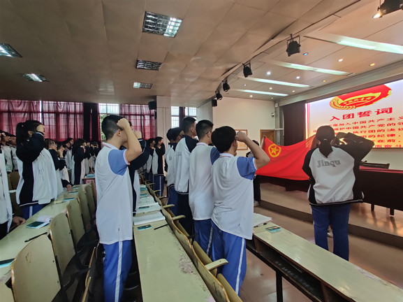 伴随着庄严的国歌声,入团仪式拉开帷幕。全体新团员精神饱满,高举右拳,面对鲜艳的团旗郑重宣誓。